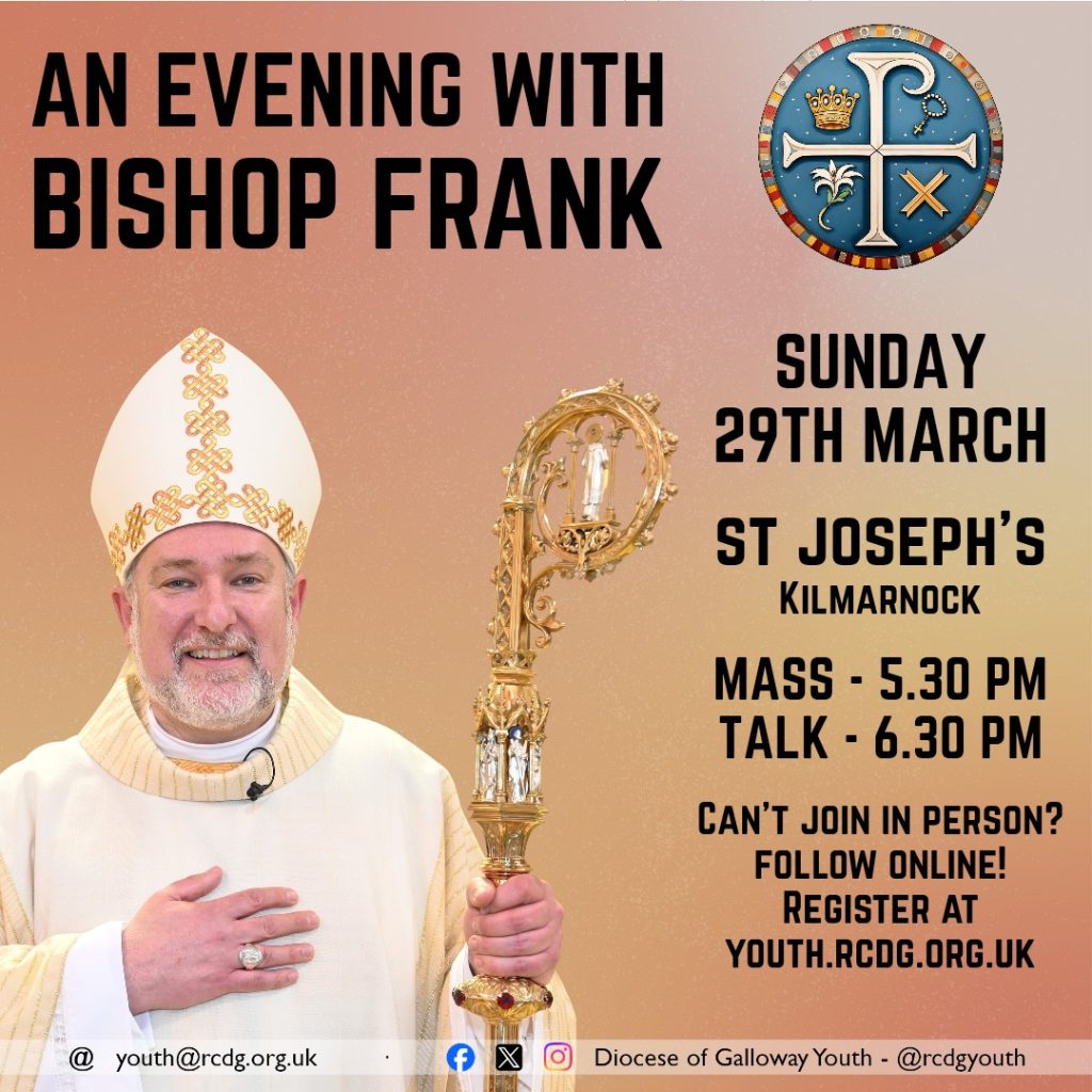 “An Evening with Bishop Frank” – The next Young Adults (S5-30) Evening takes place this Sunday in St Joseph’s Church, Kilmarnock. Join the group in hearing from and speaking to Bishop Frank on a range of topics. The evening begins with Mass at 5.30 pm, with the talk taking place in the Hall from 6.30 pm.